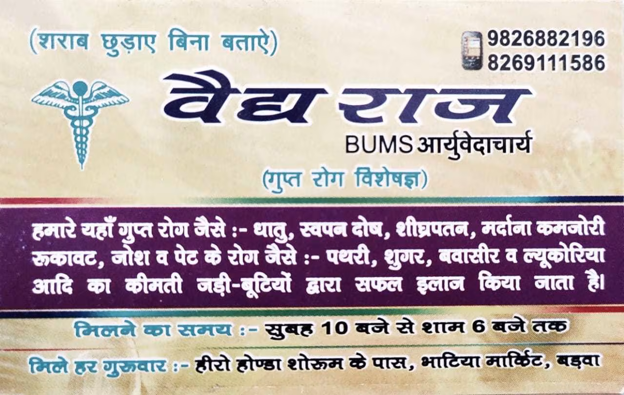 Vaidh Raaj Sexologist is a trusted Ayurvedic center with 23 years of experience in providing natural and effective solutions for sexual and general health concerns. Guided by authentic Ayurvedic principles, the clinic focuses on identifying root causes and offering personalized treatments using safe, time-tested herbal medicines. Vaidh Raaj Sexologist is known for treating a wide range of male health issues with complete privacy, honesty, and care. Every consultation is handled with sensitivity and professionalism, ensuring patients feel comfortable and confident throughout their healing journey. The approach combines traditional knowledge with practical experience to deliver reliable results without harmful side effects. Over the years, countless patients have benefited from the clinic’s dedicated service, regaining health, confidence, and peace of mind. Vaidh Raaj Sexologist believes in long-term wellness rather than temporary relief, emphasizing lifestyle guidance along with treatment. With a strong reputation built on trust, experience, and successful outcomes, the clinic continues to serve as a dependable destination for those seeking genuine Ayurvedic care.